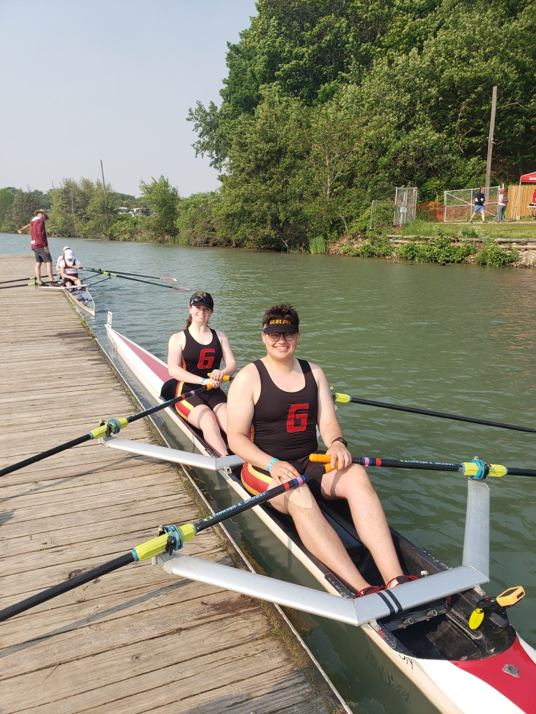 The following weekend, crews traveled to Welland for the South Niagara Invitational. Saturday’s weather was dominated by intense downpours and cold. Rowen returned to race the 1x, finishing 10th overall. Despite the rain, our day had a silver lining as Siri and Rowen paired up again in the junior 2x. They were the last boat out of the heats to make it into finals, but in the final, they rowed through all but one other boat and rowed to 2nd place! Sunday brought beautiful weather and the chance for Ethan Steele to race the Sr 1x event and immediately following that race, jump into the athlete favourite, the mixed 2x race with Reyna Rintoul. Ethan and Reyna raced extremely well finishing 3rd in their heat and just missing the final for a 7th overall placing. Not to be outdone, Jenna and Meghan raced the competitive W Sr 1x event with Jenna placing 10th overall and Meghan capturing the bronze medal.
